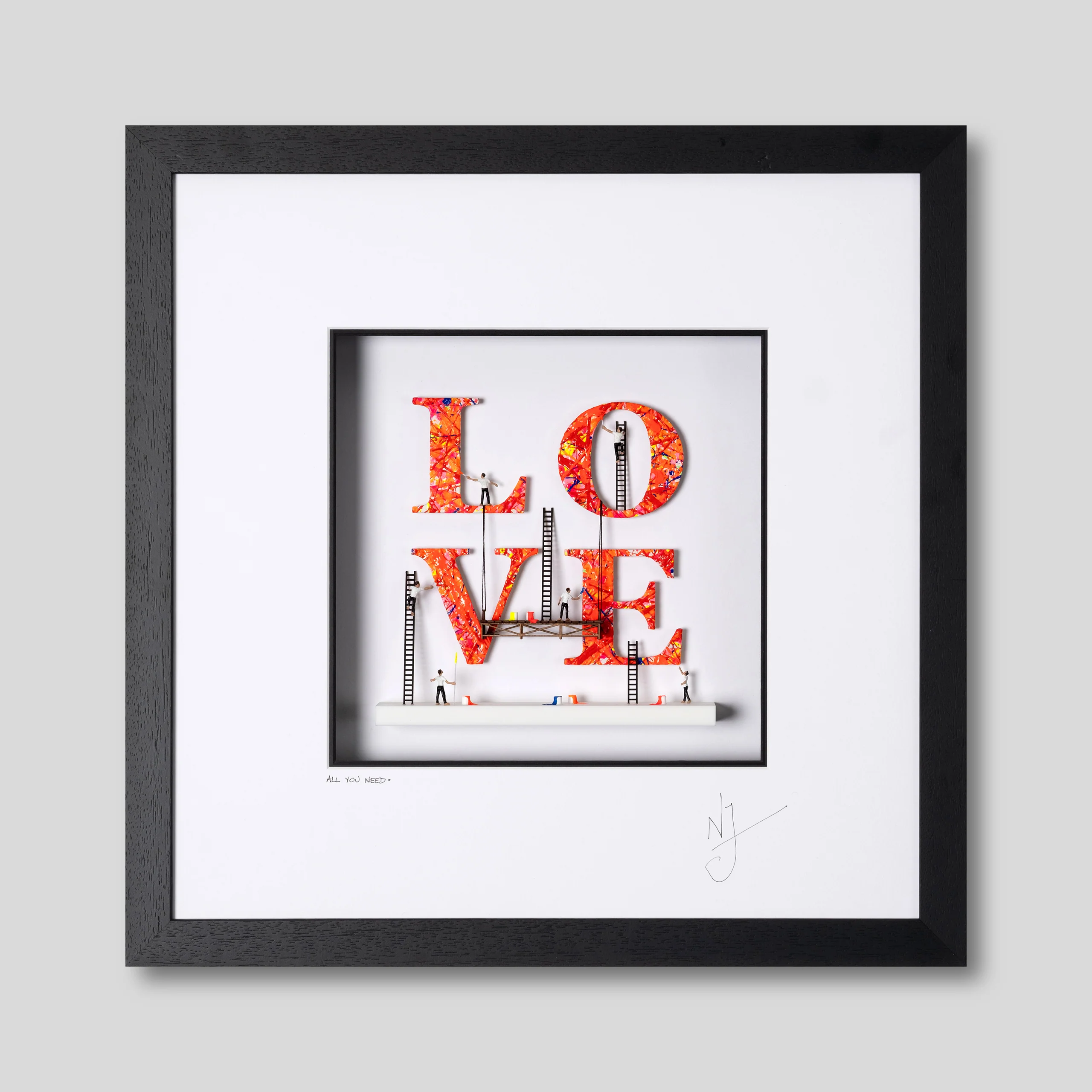 The artwork boldly features the letter LOVE with, true to Jolyâs signature style, the characteristic figures scattered around the letters. Appearing as though they are constructing the word, the small figures symbolise the effort, care and patience required to build and sustain love. The hand-painted splashes of bright neon colour, give the work an electric energy, adding playfulness and capturing loveâs unpredictability and boundless energy.